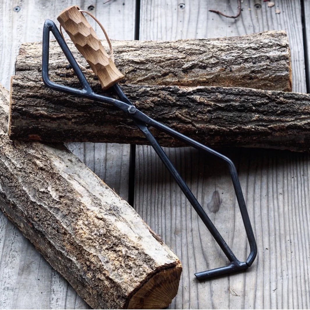 鉄とナラ材の無骨さを前面に押し出しながらも、スマートなシルエットを持つ薪ばさみ。