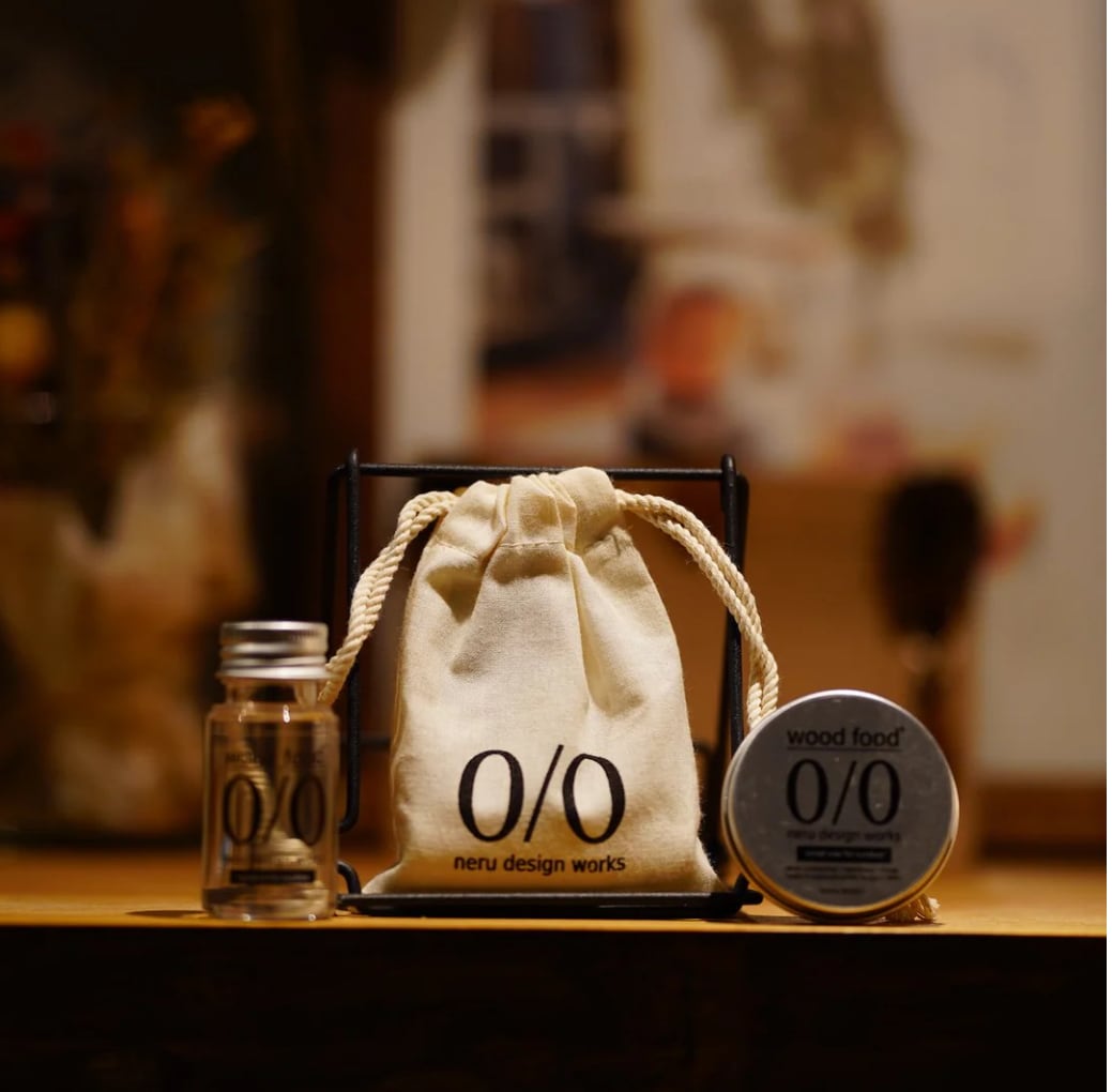 wood foodシリーズのoilとwax(小)、専用巾着のセット販売です。